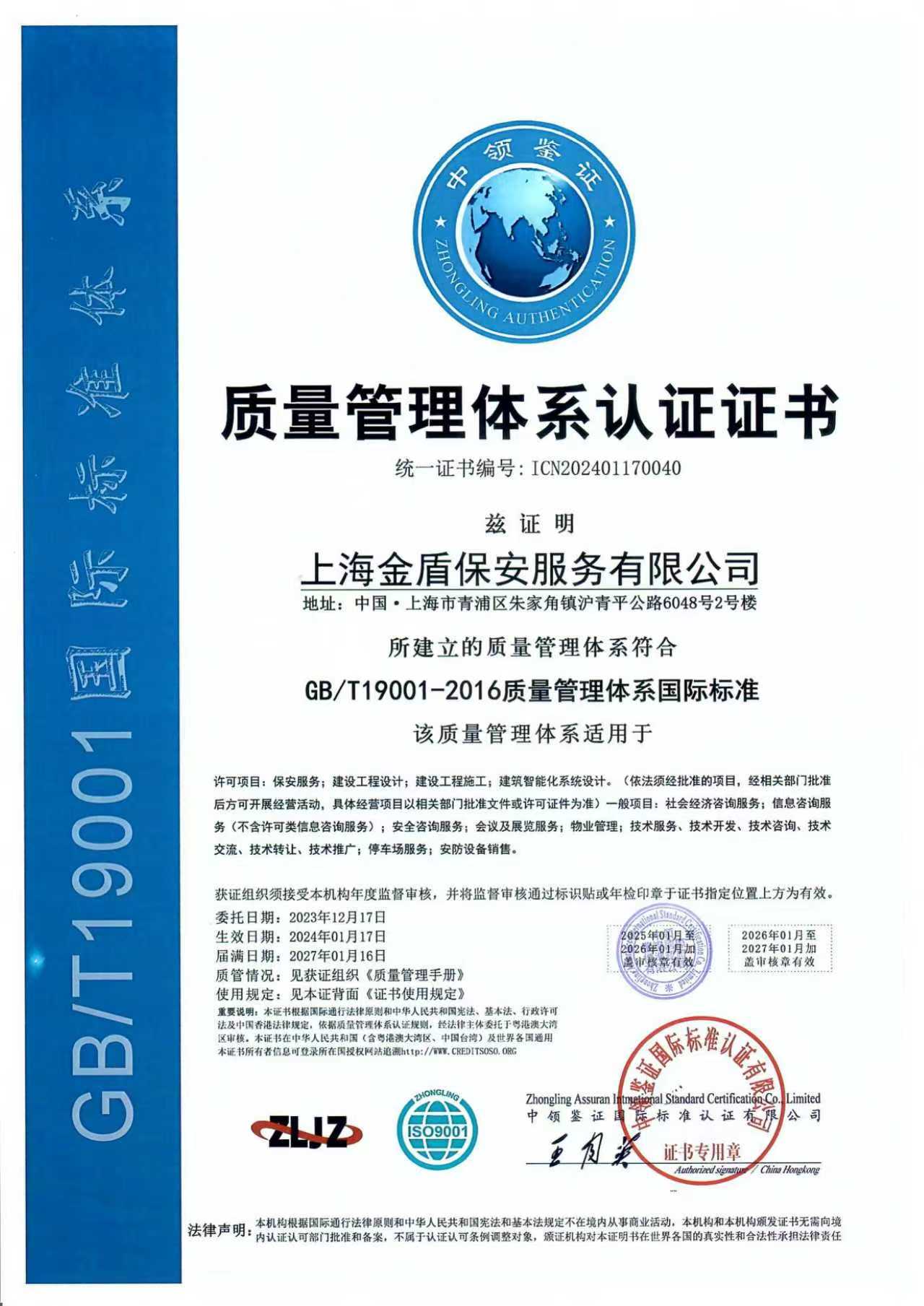 上海金盾保安服务有限公司(以下简称“金盾”)是“上海市保安协会”,“上海市安防报警协会” 会员单位;是获得上海市公安局颁发“保安服务许可证”的企业之一,公司通过了ISO9001:2015质量管理体系认证,并获得了保安服务企业一级资质证书。